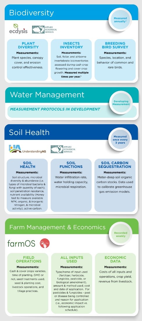We are studying changes in soil health, biodiversity, and farm economics from 51 farms across the Northern Plains of North Dakota and Canada. Of those 51 farms, 45 are receiving regenerative agriculture coaching and are implementing regenerative management plans developed with their coach. Six remaining farms, two per region, will serve as conventional control farms that will be used for comparison against the regenerative farms over time. We have developed a similar design for the 24 farmers in the Southern Plains, Kansas Regenerate Ag pilot, and the 3 dairy operations in the Michigan Regenerative Ag pilot. The following chart lays out the measurement specifics, partners and sampling frequency. A water quality measurement protocol will also be developed in 2020.